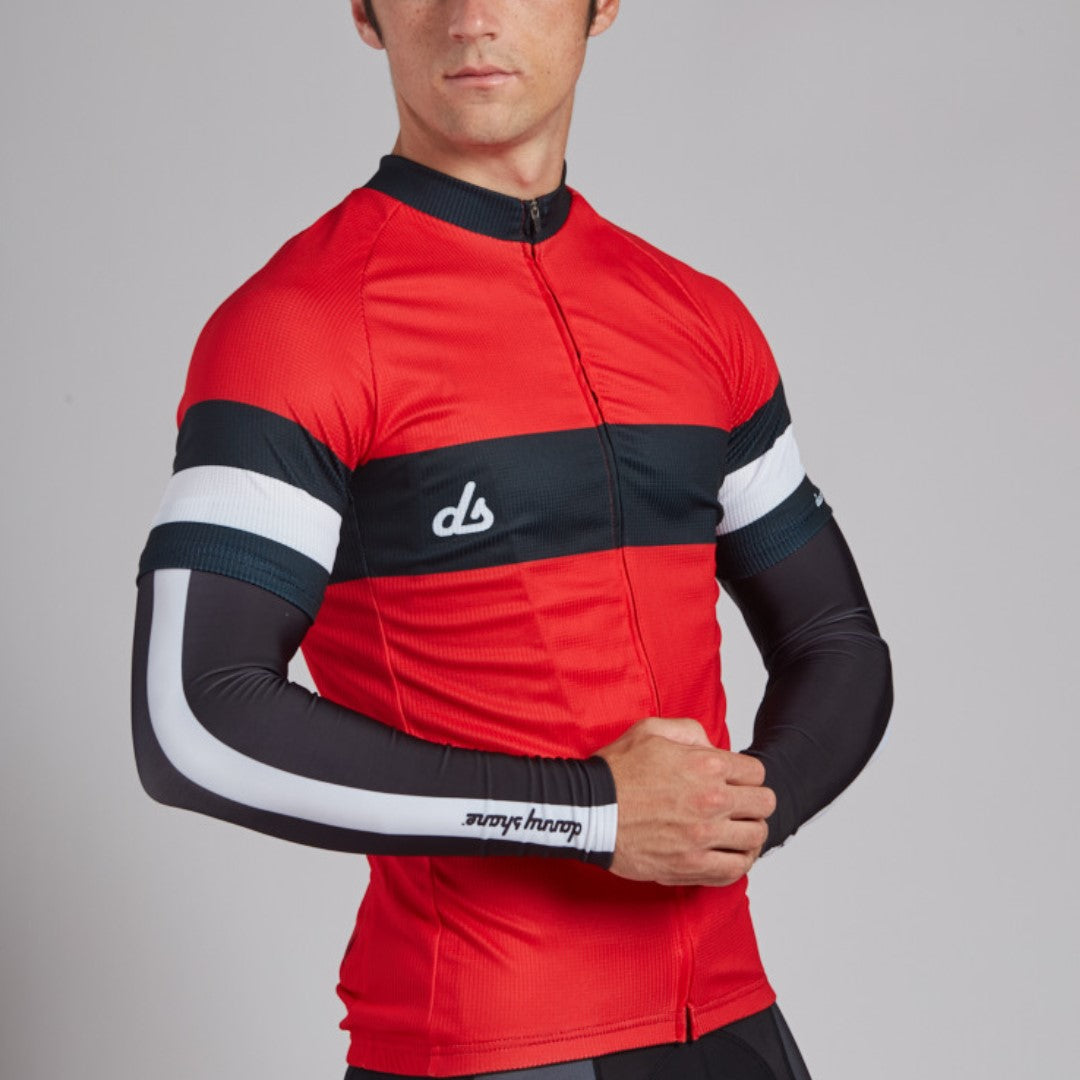 Our performance Cycling Arm Warmers are designed to bring you ultimate additional wind and cold protection while riding without limiting your movement or style. These tailored, ultra-light water-and wind resistant warmers feature a classic design with racing stripe and coordinate perfectly with other DannyShane apparel pieces.